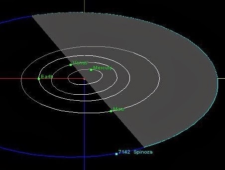 De baan en positie van de miniplaneet Spinoza is hier te zien en ook hier. Aldaar zijn ook alle gegevens van planetoïde Spinoza te vinden. Hieronder de locatie op het moment waarop ik dit blog breng.