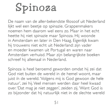 “Veel mensen vonden het helemaal niet leuk dat Spinazie zei dat God eigenlijk alleen maar een ander woord voor natuur is. Want als God zich ook gewoon aan de natuurwetten moet houden, dan is hij lang niet zo machtig als de verhalen in de Bijbel vertellen.”