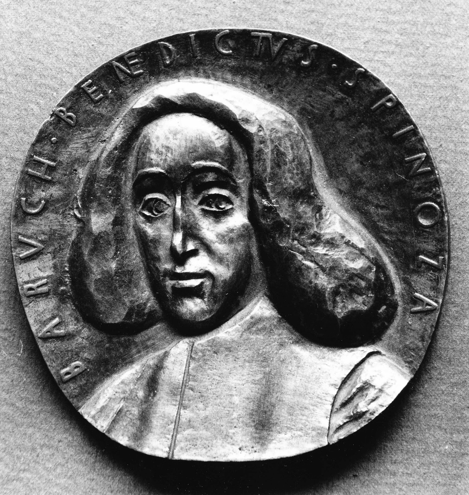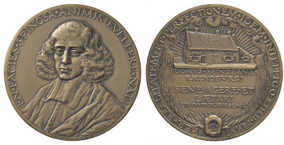 Herdenkingspenning bij 300e sterfdag van Baruch de Spinoza (1977). Door Loeki Metz. Voorzijde portret van Spinoza naar rechts. Achterzijde in driehoek Spinoza gezeten achter een bureau met wetenschappelijke attributen. Daaromheen begrippen uit zijn 'Ethica'. Brons gegoten 106-108 mm - 880 gram. [van hier; aldaar echter alweer verdwenen]