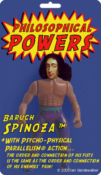 Ik twijfelde eerder of de grapkunstige reeks Philosophical Powers, waaronder Spinoza, van meer jurist dan kunstenaar Ian Vandewalker uit de jaren 2003/2004 (tevens aangetroffen bij despinoza.nl), thuis hoorde bij 'Spinoza in beeld'. Tenslotte heb ik het toch liever hier geplaatst.