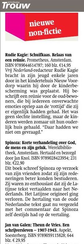 Ik vond de vermelding van de hertaling van Spinoza's KV door Jan Knol zo leuk staan in de rubriek "nieuwe non-fictie" in Trouw dat ik het als plaatje naar dit weblog haal.