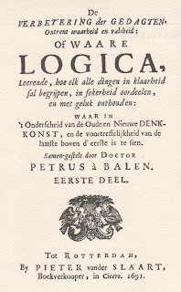 "De verbetering der gedachten omtrent waarheid en valsheid: Of Waare LOGICA Leerende, hoe elk alle dingen in klaarheit sal begrijpen, in sekerheit oordeelen, en met geluk onthouden; waar in 't Onderscheit van de Oude en Nieuwe Denkkonst, en de voortreffelijkheit van de laatste boven d'eerste is te sien. Samen-gestelt door Doctor Petrus à Balen. Tot Rotterdam, Gedrukt by Pieter Tonneman, Papier-verkoper, by den Doelen, Anno 1684." [Zo luidde het titelblad van de eerste uitgave; hiernaast staat het titelblad van het eerste deel van de tweede uitgave).