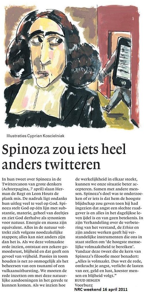 Deze tekst was al door Leon Heuts ingebracht in een reactie bij het blog van 3 april (Filosofie teruggebracht tot gekwetter van grote denkers), maar ik vond het wel leuk om het stuk over Spinoza ook in de vorm waarin het donderdag in de krant stond, hier te plaatsen nadat ik het van een bezoeker van dit weblog heden ontving.