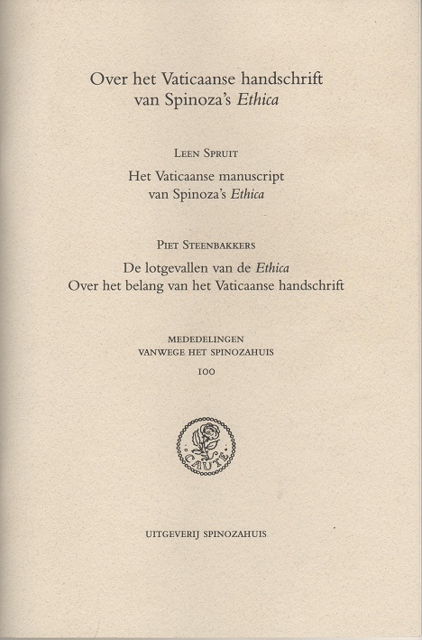 Het ging nu om het 100e boekje in de reeks, getiteld: Over het Vaticaanse handschrift van Spinoza’s Ethica, waarover zodadelijk. Een mijlpaal. En door een toevalligheid werd dat gevierd door het in een nieuw jasje te steken. De voorafgaande Mededelingen droegen een grijze kaft. De drukker had de Vereniging laten weten dat datzelfde grijze zware papier niet meer geleverd kon worden. Daarom is besloten het boekwerkje een chamois-achtige kaft te geven. Maar een goede greep was om dan ook het binnenwerk niet meer op wit papier, maar op een licht-charmoiskleurig papier te drukken. En dat geeft een zeer gedistingeerde, chique uitstraling. Heel plezierig om ter hand te nemen en te lezen. Een heel goede greep.