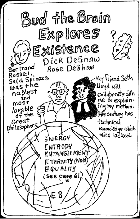 Twee maanden geleden bracht hij een fascinerend Graphic Essay on Spinoza: Bud the Brain Explores Existence [PDF van 7,39 Mb, 323 pp] - daarbinnen ook een autobiografisch verhaal over zijn ontdekking van Spinoza. Daarin brengt hij zijn begrip van Spinoza tezamen met een soort aanpassing aan de moderne natuurkunde. Allerlei onderwerpen die in de reacties op dit Spinozablog soms aan de orde zijn, komen ook in dit verhaal langs.