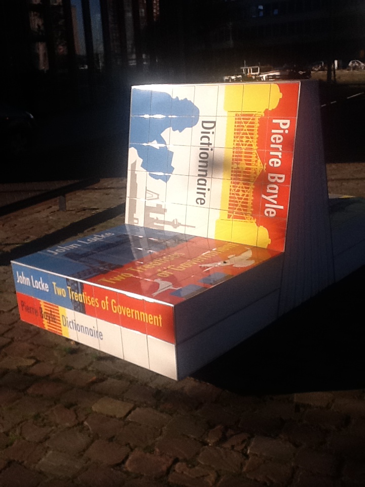 Gisteren stuurde Wim Klever mij onderstaande foto van het kunstwerk van Saskia Wigbold: een filosofenbank met de naam: 'de vrije denkers'. In september dit jaar werd het kunstwerk onthuld op de plek in Rotterdamse Scheepmakershaven waar in de zeventiende eeuw het roemruchte café de Lantaarn stond, waar grote denkers uit de Verlichting als Pierre Bayle, Bernard Mandeville en John Locke samenkwamen. De bank is samengesteld uit: Erasmus' Lof der zotheid, Hugo de Groot’s Mare Librum, John Locke’s Two Treatises of Government en Pierre Bayle’s Dictionnaire – voor Bernard Mandeville was blijkbaar geen ruimte meer, of die werd niet groot genoeg bevonden.