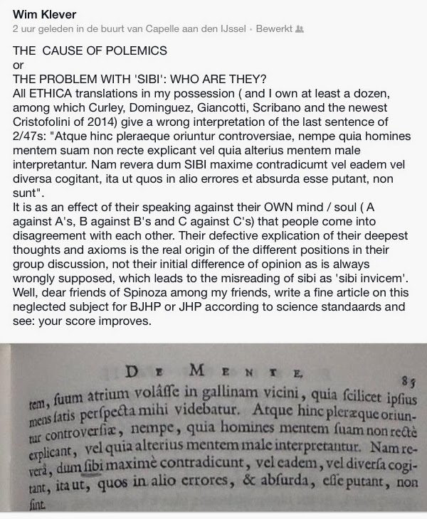 In het artikel wil Sangiacomo voortbouwen in een richting die eerder werd aangegeven door Steven Nadler, maar daarbij toch ook weer een andere weg inslaan - daarover straks meer. Maar eerst beken ik nog dat ik er een heel andere blogs over ga schrijven dan ik aanvankelijk van plan was. Ik meende namelijk dat er iets niet kon kloppen in Sangiacomo's benadering (ik zal straks nog aangeven waar ik dacht dat hij in de fout ging). Ik heb zijn tekst, zowel in het Engels als in de vertaling van Karel D'huyvetters, bij elkaar wel zo'n zes keer gelezen - aanvankelijk met het schoolmeesterlijk potloodje in de hand om goed te ontdekken waar het toch fout ging. Tot gelukkig het kwartje viel en ik zag wat een meesterlijk stuk Andrea Sangiacomo geschreven heeft. Het was voor mezelf weer eens een bewijs, hoe moeilijk goed lezen en luisteren is, daar je al (bevooroordeelde zgn. eigen of voor-)kennis hebt, waarvan je je verstand moet zuiveren om hem te verbeteren. Enfin, we zitten zo helemaal in Spinoza. Nogmaals, hier kom ik later nog op terug. Ik begin eerst met wat eraan voorafging: het stuk van Steven Nadler.