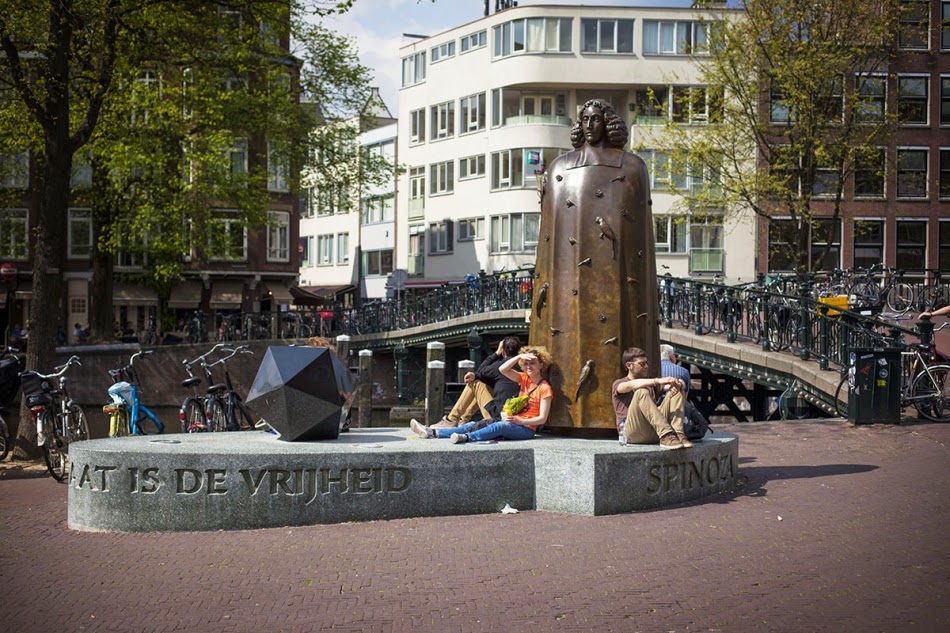 Vorige week woensdag, op 23 april 2014, maakte beroepsfotograaf Maarten Brante deze foto van mensen, lekker genietend van 't voorjaarszonnetje op het Amsterdamse Spinozabeeld.