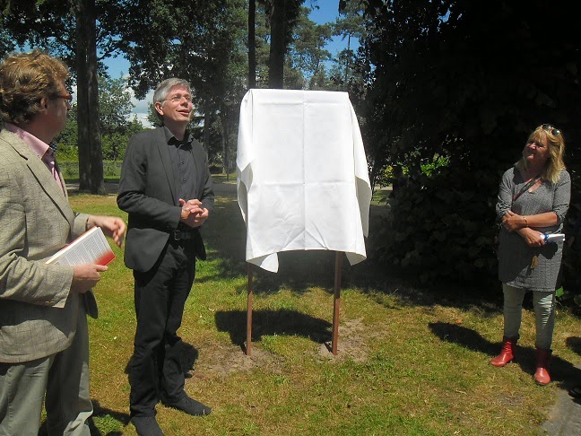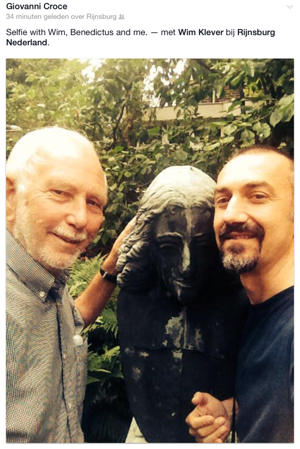 En zie, 's avonds zond hij mij daarvan deze selfie, gemaakt door Giovanni Groce met hem en Spinozas beeld in de tuin van diens huis in Rijnsburg. Zo wordt Spinoza opgenomen in de moderne tijd, waarin er een meer familiaire verhouding tot hem lijkt te ontstaan.