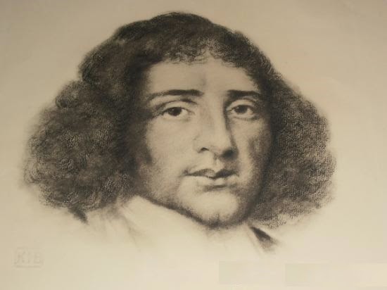 Maandag, op Spinoza's geboortedag, verscheen op een Macedonische website dit detail van deze treffende Spinoza-tekening. Er werd niet bij vermeld wie de maker ervan is, noch waar hij eventueel gevonden was. Toch plaats ik deze afbeelding alvast in dit blog, in de hoop er nog eens meer van te weten te komen. En hem ooit in z'n geheel aan te treffen.