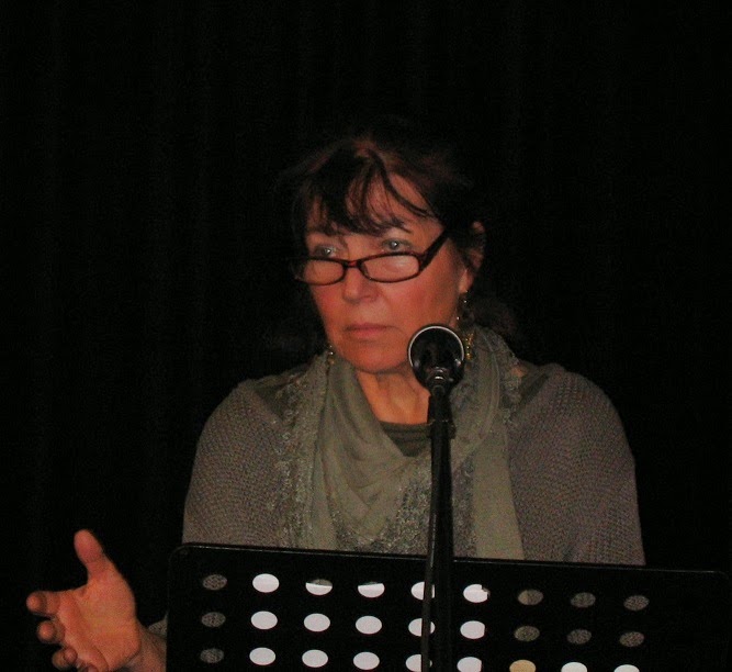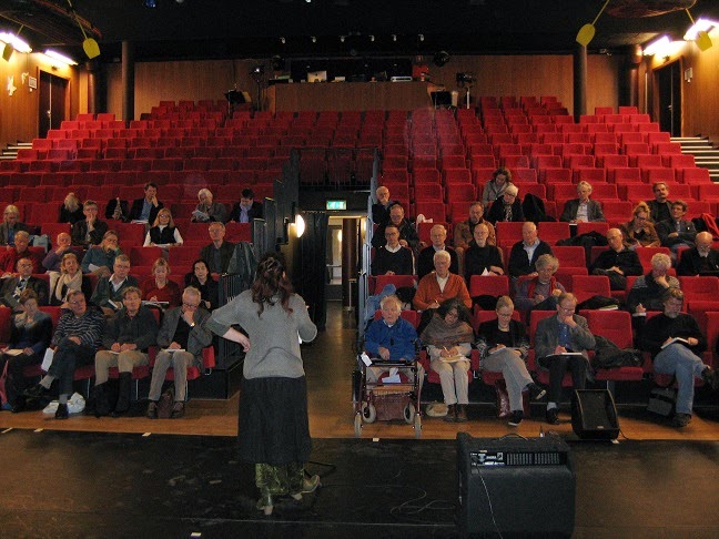 Miriam van Reijen voor het gehoor in de aula van het Spinoza Lyceum in Amsterdam (dat gehoor was groter: er zaten