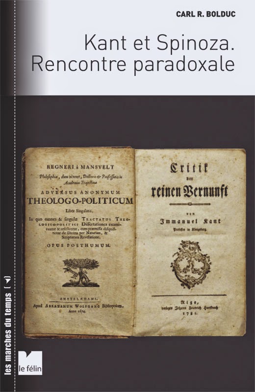 Carl R. Bolduc, Kant et Spinoza. Rencontre paradoxale. Éditions Du Félin, date de parution le 24 Avril 2015 - Table des matières [PDF] - Lire le premier Chapitre [PDF]