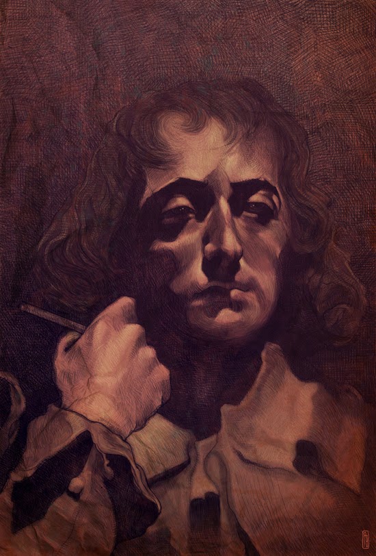 Philipp Banken, illustrator, werkzaam in Trier, in de Rheinland-Pfalz, plaatste gisteren deze Spinoza-tekening (van 21x32 cm) op zijn blog en op de internetgallery, waaraan hij verbonden is, die afdrukken te koop aanbiedt in diverse afmetingen op papier (gallery quality Giclée print on natural white, matte, ultra smooth, 100% cotton rag, acid and lignin free archival paper using Epson K3 archival inks) of op canvas. Graag geef ik dit door voor eventuele liefhebbers.