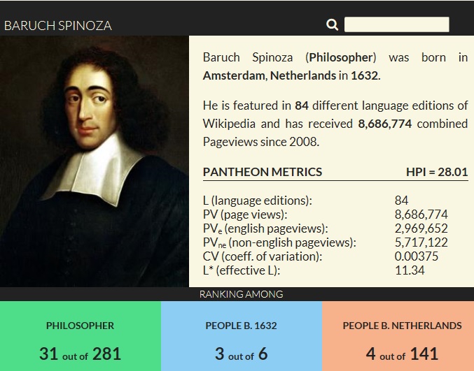 Adèle Meijer wees mij op dit project, Pantheon. Mapping Historical Cultural Production, waarin gekeken wordt hoeveel Wikipediapagina's er in de wereld over beroemdheden bestaan en hoevaak daarnaar gekeken wordt. Ook Spinoza is uiteraard in het databestand opgenomen. Zo kan men zien naar welke wetenschappers, filosofen, kunstenaars en andere beroemdheden belangstelling uitgaat. Ach, iets voor de rubriek met kleine feitjes.