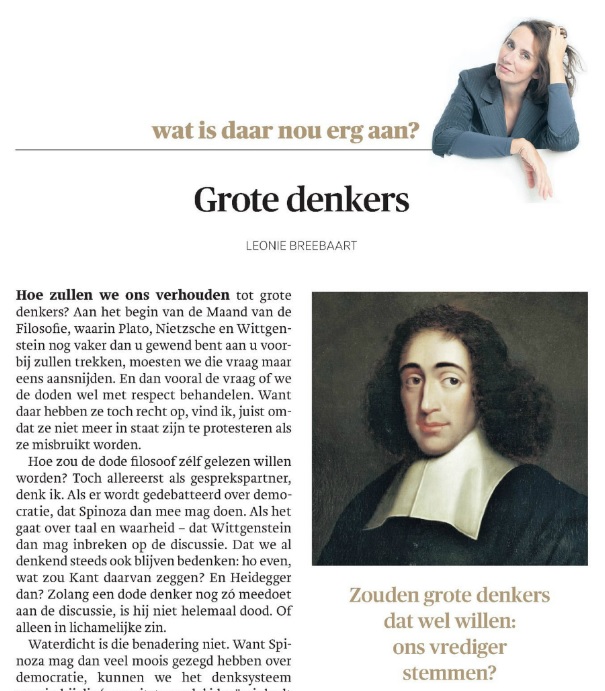 Het doet mij deugd regelmatig te bemerken dat de redacteur filosofie van dagblad Trouw, Leonie Breebaart, Spinoza niet uit de weg gaat. Zij is ook columnist van het zaterdagse magazine Letter & Geest van Trouw. En in die hoedanigheid had ze vandaag een column, die niet specifiek of uitsluitend maar ook over Spinoza ging en in ieder geval met hem geïllustreerd werd. De column is getiteld "Grote denkers" en is een overdenking aan het begin van de Maand van de Filosofie. Zij heeft de indruk dat cursussen, zoals die van The School of Life, filosofen willen gebruiken om mensen een fijn gevoel te geven en gerust te stellen, terwijl volgens haar de meeste denkers, zoals Spinoza, ons juist uit de slaap willen houden met ontwrichtende ideeën. Ik hoop dat een klik op de afbeelding u bij de tekst laat (maar misschien ziet die achter een betaalmuur – maar het thema van de Maand van de Filosofie is: Over de grens).