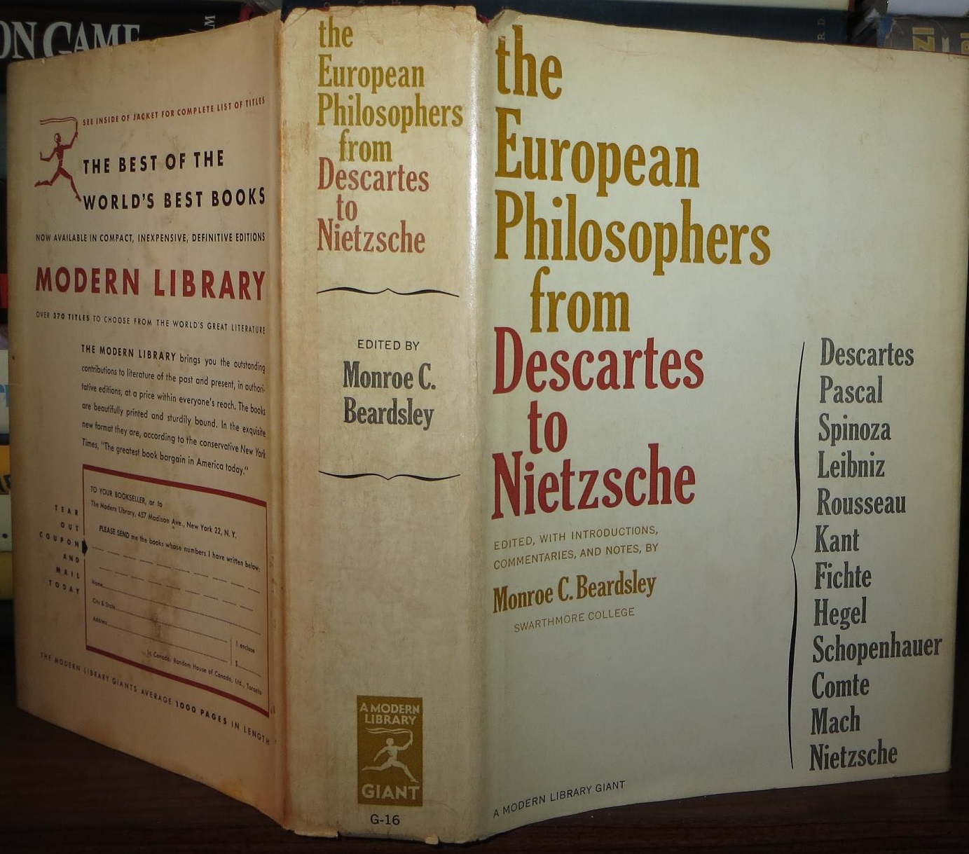 Monroe C. Beardsley (Ed.), The European Philosophers From Descartes to Nietzsche [Descartes, Pascal, Spinoza, Leibniz, Rousseau, Kant, Fichte, Hegel, Schopenhauer, Comte, Mach, Nietzsche ].New York: Modern Library, 1960, 1977, [A Modern Library Giant], 1992 [reprint 2002]