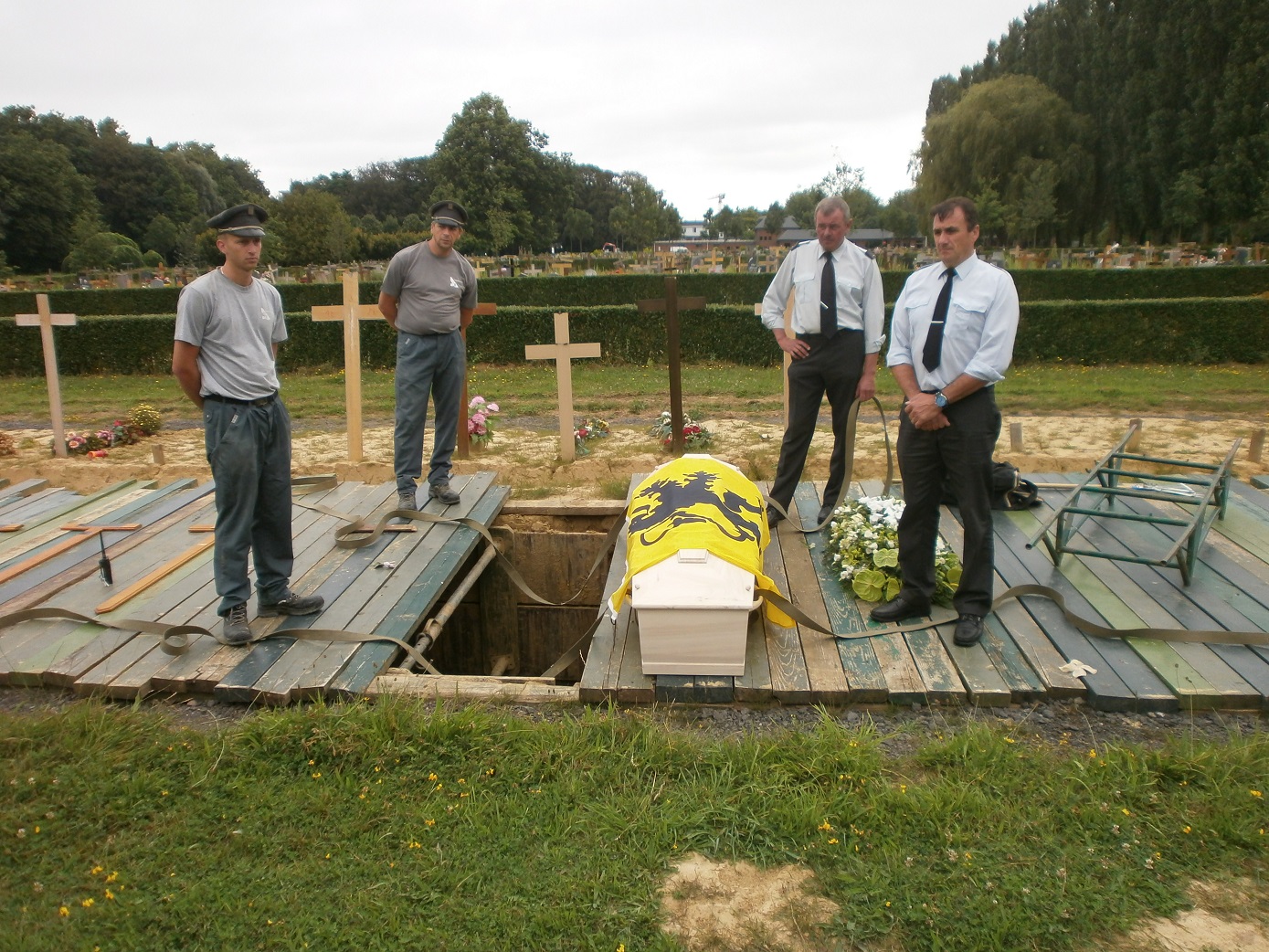 Gisteren is hij in een kleine kring van familieleden en vrienden met wie hij nog contact had, waaronder Michiel, begraven in Anderlecht, waar hij bijna zijn hele leven gewoond heeft in een huis dat zijn ouders hadden laten bouwen. Er waren geen speeches. De kist was bedekt met de vlag van de Vlaamse onafhankelijkheid (zie foto).