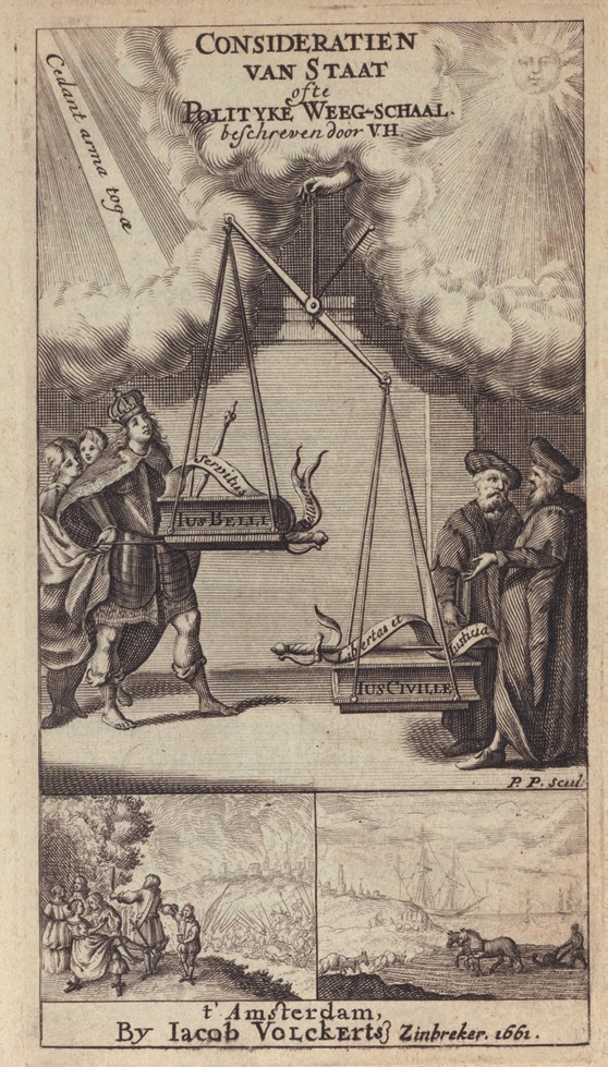Frontispice van Johan en Pieter de la Court, Consideratien van Staat, ofte Polityke Weeg-schaal, 1661. [Universiteitsbibliotheek Amsterdam, OTM: OG 63-822]
