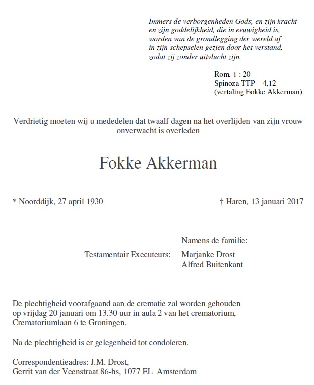 Fokke Akkerman (1930 – 2017) is vrijdag 13 januari overleden