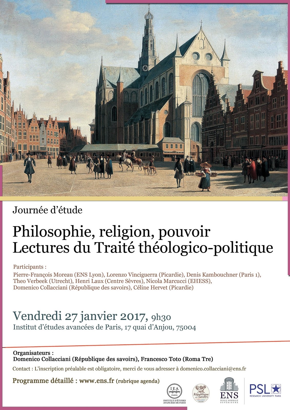 Volgende week vrijdag, 27 januari 2017, wordt aan het IEA, L’Institut d’études avancées de Paris, een studiedag gewijd aan de Tractatus Theologico-politicus. Het is de 3e in een reeks van vier van zulke studiedagen die Pierre-François Moreau en Francesco Toto (e.a.) organiseren over Spinoza’s TTP. De eerste bijeenkomsten vonden plaats op 20 en 21 december in Rome. De tweede en de derde vinden respectievelijk plaats in Parijs (27 januari 2017) en in Lyon (4 en 5 april 2017). Hier het programma van de bijeenkomst volgende week in Parijs. Op affiche en flyer wordt een afbeelding gebruikt die niet wordt toegelicht.