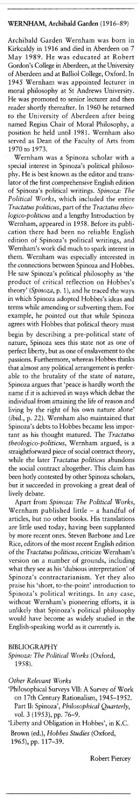 Dit blog over Wernham die - volgens Theun de Vries, weet ik inmiddels – “een gehavende editie” van Spinoza politieke werken verzorgde, zou er niet gekomen zijn, als mijn speuractie niet vanuit een misverstand was ontstaan. Alan Donagan, voor wie ik onderhand een almaar groeiende waardering voor zijn Spinozastudie heb gekregen, schreef op blz. 167 van zijn Spinoza, “Spinoza’s use of words like ‘ductus’, ‘dictamen’, and praeceptum in connection with reason is metaphorical, and Wernham has correctly described it as misleading so.” En in de bijbehorende voetnoot: “Wernham’s treatment of Spinoza’s transformation of the language of morals is masterly. [..]” Als ‘mijn meester’ dat zo enthousiast zegt, laat ik mij stimuleren! In de bibliografie van Donagan's boek stond één artikel van Wernham vermeld, “Spinoza’s account of cognition in Ethics Part II, Prop. 9-13” in: J.G. van der Bend, Spinoza on Knowing, Being and Freedom (Assen, van Gorcum, 1974).