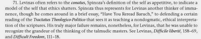 71. Levinas often refers to the conatus, Spinoza's definition of the self as appetitive, to indicate a model of the self that ethics shatters. Spinoza thus represents for Levinas another thinker of immanence, though he comes around in a brief essay, "Have You Reread Baruch," to defending a certain reading of the Tractatus Theologico-Politico that sees it as teaching a nondogmatic, ethical interpretation of the scriptures. His truly major failure remains, nonetheless, for Levinas, that he was unable to recognize the grandeur of the thinking of the talmudic masters. See Levinas, Difficile liberté, 158-69, and Difficult Freedom, 111-18.