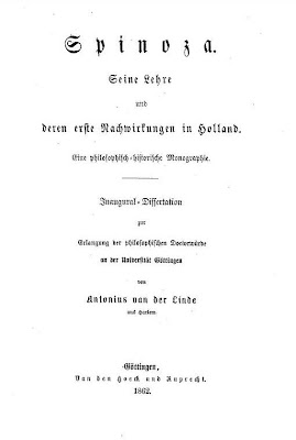 Hij gebruikte deze boeken voor zijn Benedictus Spinoza-bibliografie [Martinus Nijhoff, 's Gravenhage, 1871 - hier op internet te raadplegen]. In een voetnoot kan Thissen het opbrengen toe te geven: “Overigens droeg Van der Linde - als bibliothecaris - bij aan het internationale Spinozaonderzoek dankzij Benedictus Spinoza: Bibliographie (Den Haag 1871). Twee jaar eerder verscheen zijn Balthasar Bekker: Bibliographie (Den Haag 1869).” 6) [Bij books-google te downloaden]