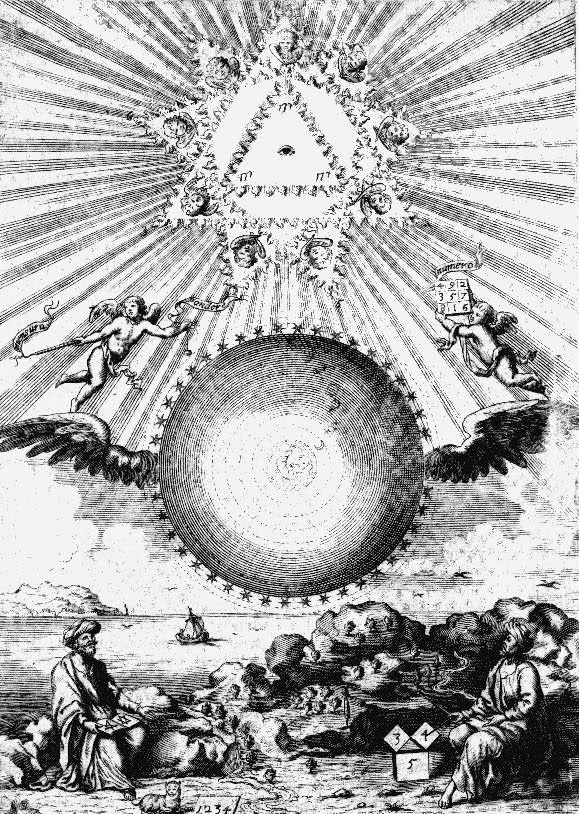 In de afbeelding Arithmologia van Athenasius Kirchner is in het bovenste deel iets van het beeld van de architectus mundi terug te vinden. In het onderste deel dat onze wereld voorstelt laat Kircher zien dat hij een stap verder gaat: hij laat er de beide geleerden de mathematische code van de wereld ontsleutelen.