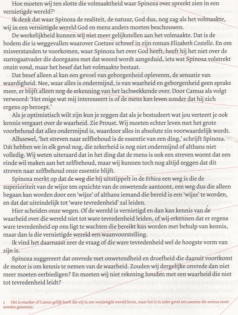Maar in de tekst in dit boekje kan ik niet meer zien dan een beetje in-en-uit-praten met af en toe een citaat uit Spinoza: over vrijheid, het niet bestaan van vrije wil, over noodzakelijkheid, over slavernij, over dat de mens begeerte/verlangen is, over iets als (in mijn woorden) “waar begeerte was, moet rede worden”, over medelijden als droeve gemoedsaandoening en onjuiste raadgever voor handelen, hetzelfde wat betreft rechtvaardigheidsgevoel en i.h.a. elk gevoel dat geen goede raadgever is, dat – economisch, sociaal-psychologisch etc. - bedrog de gedaante van wetenschap kan aannemen en ook van kunst trouwens.