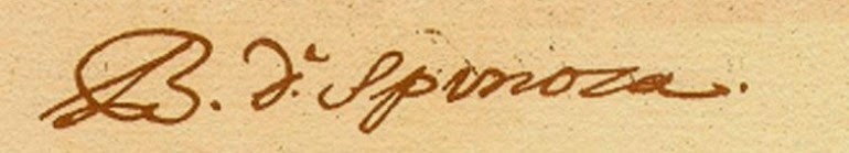 1. Juni 1662 Benedictus Spiñoza (Brief an Oldenburg).— 2. und 3. 3. August 1663 B. d' Spinoza und B. de Spinoza (Brief an Meyer). — 4. 13. März 1665 B. de Spinoza (Brief an Blyenbergh). — 5. 3. Juni 1665 B. de Spinoza (Brief an Blyenbergh). — 6. 20. November 1665 B. de Spinoza (Brief an Oldenburg).— 7.21. October 1671 B. despinoza (Document des Notars Ennis). — 8. 9. November 1671 B. despinoza (Brief an Leibniz).— 9. 14. December 1673 Benedictus despinoza (Brief an Graevius). — 10. Juli 1675 B. de Spinoza (Brief an Velthuysen). — 11. 18. November 1675 B despinoza (Brief an Schuller).
