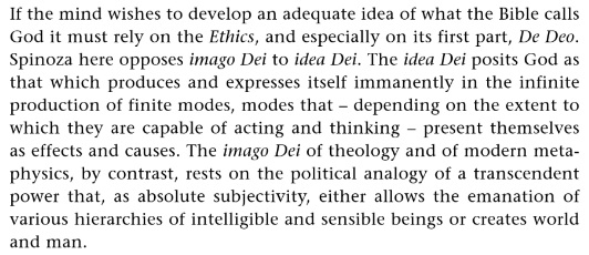 Volgens mij kunnen we, wat Spinoza betreft, geen beeld van God hebben, wel een verstandelijk idee. Beelden maak je met de imaginatio en Spinoza heeft alleen maar kritiek op de beelden die mensen van God maken. Dat bedoelde ik met te benadrukken dat je m.i. Spinoza niet echt met een imago Dei in verband kunt brengen. Die woorden tref je in ieder geval niet bij hem aan. En ja, met "impliciet" kun je alle kanten op.