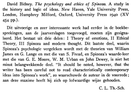 Bidney, David. The Psychology and Ethics of Spinoza. A Study in the History and Logic of Ideas. New Haven [e.a.] : Yale Univ. Press, 1940. - XV, 454 pp. Herdruk New York, Russelland Russell, 1962. Volgens hemzelf een vervolg op zijn dissertatie.