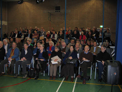 Na vorig jaar naar de IVKO-school in Amsterdam te zijn uitgeweken, wamen we dit jaar weer bijeen in het Spinozalyceum, hoewel de renovatie nog niet gereed was. We kwamen bijeen in de provisorische aula. De foto's geven een indruk van opkomst en locatie.