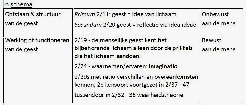 Hetgeen in het middelste blok staat is direct van Spinoza. De ordening en wat er in de randen omheen staat volgt uit mijn analyse, maar is in mijn opvatting ontleend aan hoe Spinoza zijn geest-theorie opzet en gebruikt.