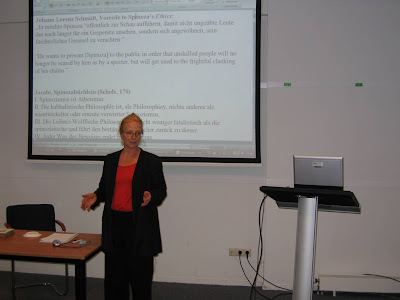 De inleidster ging uitvoerig in op de strijd over de vraag of de vroege Leibniz nu wel of geen Spinozist was. Ze vertelde over haar ontdekking van de marginaliën van Leibniz in de TTP die hij las met potloodje in de hand. Hij was zéér geïnteresseerd, maar geen aanhanger (de vrije wil!). Voorts ging het over Christan Wolff; en over de 1e Duitse vertaling in 1742 door Schmidt.