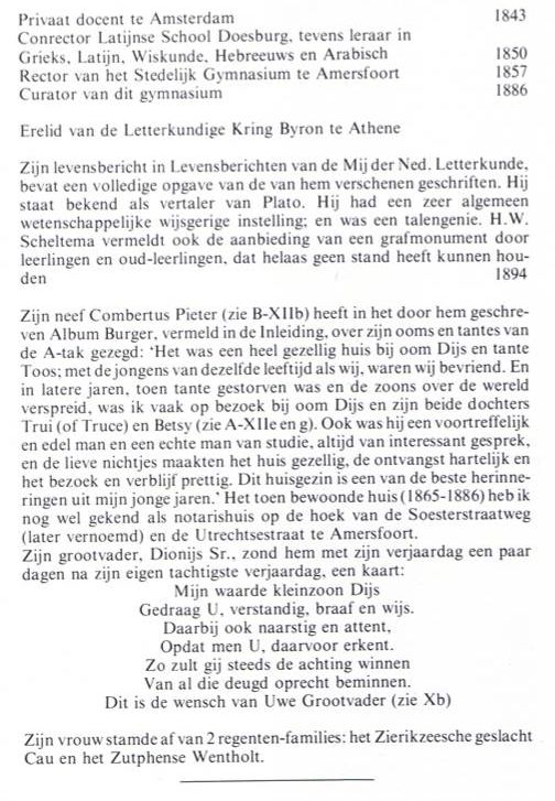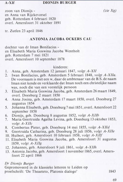 N.a.v. de reactie van Jan Willem Reitsma (zie onder reacties) konden onderstaande scans, alsmede het bovenstaande portret van Dionijs Burger aan dit blog worden toegevoegd. De gegevens stammen uit de familiegenealogie: F.W. Burger, Genealogie van de familie Burger. Bewerkt en uitgebreid naar vroegere uitgaven, tot en met mei 1977, familie-uitgave, z.j. (maar uit 1978).