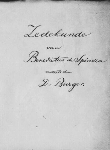 Omstreeks 1860 maakte Burger een minutieuze vertaling van Spinoza’s Ethica, die hij overigens niet uitgaf. Het was de eerste Nederlandse vertaling sinds die van Jan Glazemaker uit 1677. Piet Steenbakkers die de vertaling beoordeelde 4) - zo lees ik bij Siebe Thissen 3) - betreurde in zijn overzicht van de Nederlandse Ethica-vertalingen het feit dat deze vertaling nooit was uitgegeven. Hij vindt dat de vertaler 'een indrukwekkende prestatie' heeft geleverd in een 'zorgvuldig en trefzeker' handschrift. Hij suggereert dat Burger de vertaling niet uitgaf, daar hij de tijd nog niet rijp voor Spinoza achtte. De Nederlandse Spinoza-receptie kwam toen inderdaad nog maar pas in gang.