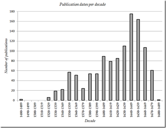 Hieronder nog een grafiekje dat de ‘leeftijd’ van de boeken in Bouwmeesters collectie weergeeft in de vorm van het aantal titels per decennium, waaruit nog duidelijker blijkt dat het echt wel om een ‘moderne’ bibliotheek ging.