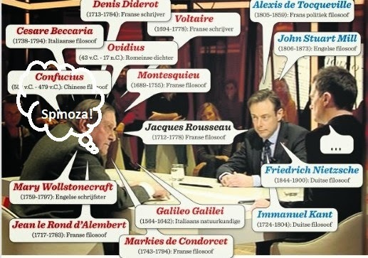In februari 2013 was er in 'Reyers laat' een debat tussen Bart De Wever en Etienne Vermeersch - het haalde zowat het dubbele van het aantal kijkers dat 'Reyers laat' normaal haalt. De Standaard bracht bij een stukje van Chris Snick over dit "filosofisch debat" een aardige illustratie met de namen die daarin zoal gevallen waren. Spinoza stond daar stond echter niet bij. Het kan haast niet dat Vermeersch die naam niet had laten vallen. En anders heeft hij toch minstens gedacht dat hij Spinoza was. Daarom heb ik in een denkwolkje diens naam toegevoegd.