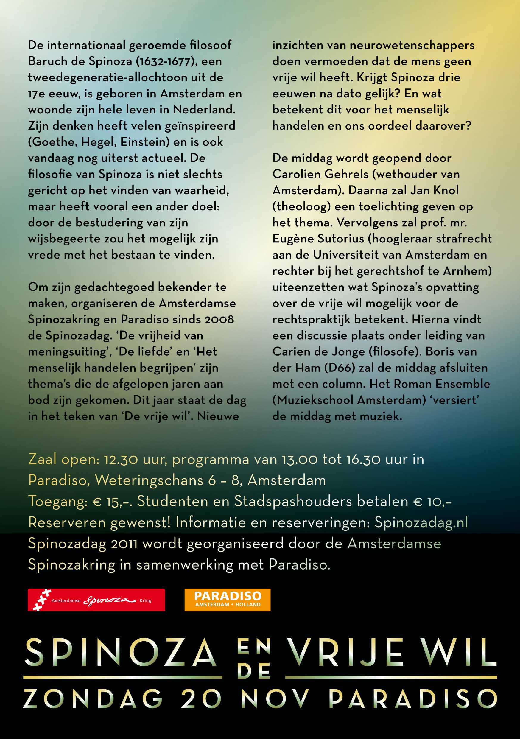 Heden werd de poster over de komende Spinozadag die op zondag 20 november 2011 in Paradiso wordt gehouden, op de website van de Amsterdamse Spinoza Kring geplaats. Het thema is, zoals al langer bekend: "Spinoza en de vrije wil". Meer bij de Ask.