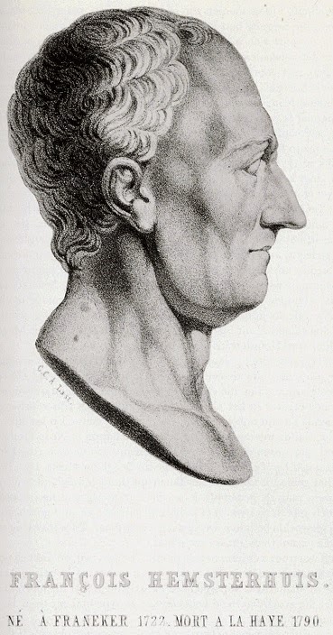 Frans Hemsterhuis groeide op in Franeker en verhuisde in 1740 naar Leiden, waar zijn vader hoogleraar Grieks werd. Pas op 24 juni 1747 schreef hij zich als student wiskunde in. Hij raakte bevriend en bleef dat z’n hele leven met Petrus Camper (1722-1789) – zij deelden hun belangstelling voor wis- en natuurkunde. Bij David Ruhnken deed hij zijn liefde op voor Socrates en Plato. (Hij werd wel de ‘Bataafse Socrates’ genoemd). Na enige activiteiten in Frankrijk en Duitsland werd hij in 1755 secretaris van de Raad van State, wat hij tot zijn pensionering in 1780 bleef.