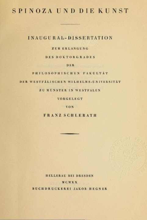 Franz Schlerath, Spinoza und die Kunst [Inaugural-Dissertation 17 november 1918]. Hellerau bei Dresden, Buchdruckerei J. Hegner, 1920 - 84 p.