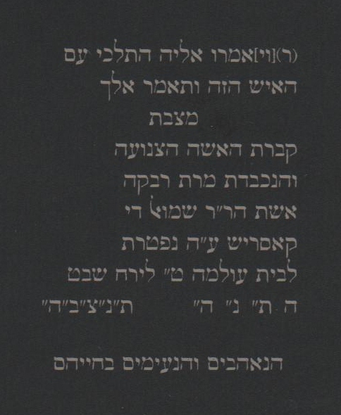 Grafsteen van de deugdzame en eerbare vrouw Ribca, echtgenote van de heer Samuel de Casseres, moge ze rusten in vrede, die op de 9e van de maand Sjewat 5455 is opgenomen tot hogere sferen. Moge haar ziel worden opgenomen in de verzameling van (eeuwige) levens.