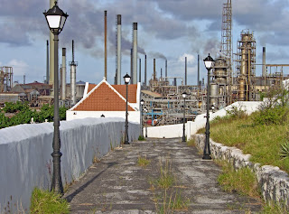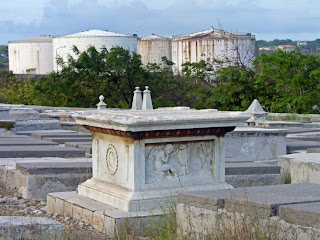 Daarop is al duidelijk te zien dat die begraafplaats daar niet lekker ligt. Op de volgende foto van Lex Speelman, genomen op 22 nov. 2007, is dat nóg duidelijker te zien [van hier]. Op de achtergrond "Refineria Isla" (olieraffinaderij), Curaçao's grootste werkgever.