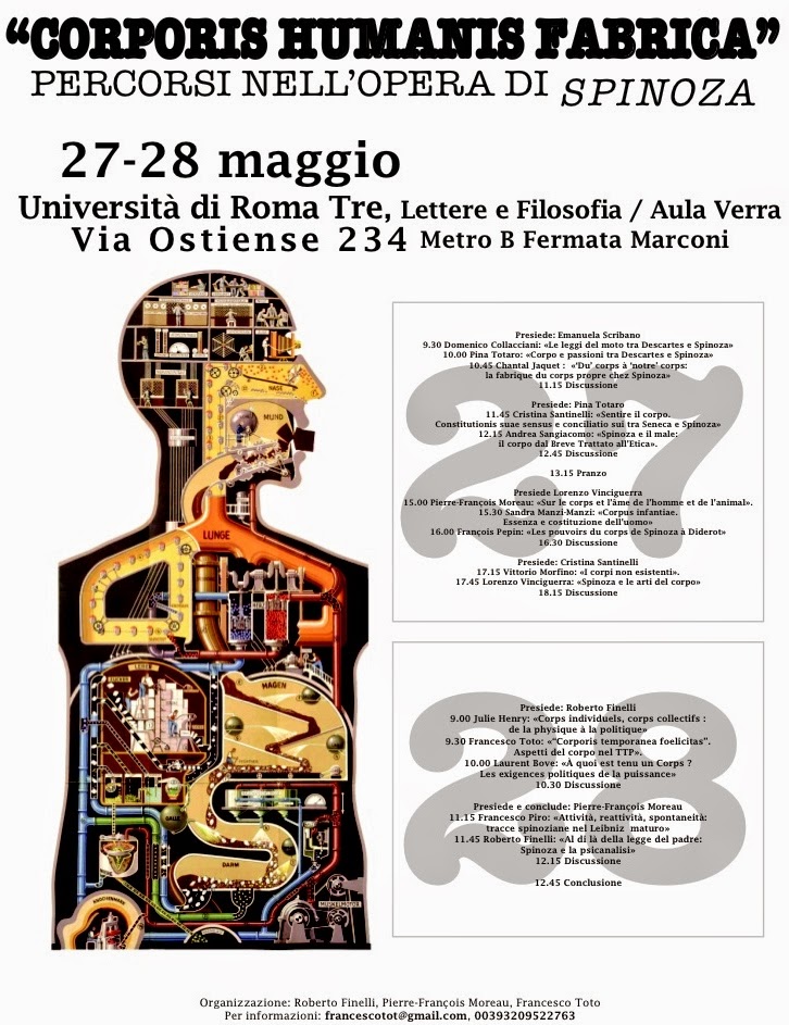 En dit ontdekte ik heden weer in IJSBRAND VAN DIEMERBROECK - VERHANDELING OVER DE PEST. Ingeleid, vertaald en van aantekeningen voorzien door Dr. A.H.M. Kerkhoff [PDF], waaruit bovenstaande gegevens. Dit kwam ik tegen nadat ik van Wim Klever onderstaande scan ontving over een conferentie die binnenkort gehouden wordt over "corporis humanis fabrica" percorsi nell'opera di Spinoza. Ik vraag me af of humanis die 's' wel dient te torsen (en of er geen voorzetsel bij hoort 'de' of 'ex'), als ik kijk naar bovenstaande boektitels en naar de (enige) plaats in Spinoza waarnaar de titel van de conferentie een referentie zal zijn.