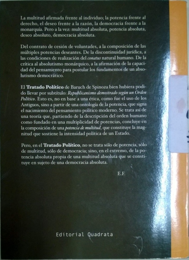 Spinoza, Baruch, Tratado político, traducción de Eric Fontanals, introducción y notas de Ernesto Funes, Quadrata, Buenos Aires, 2003.