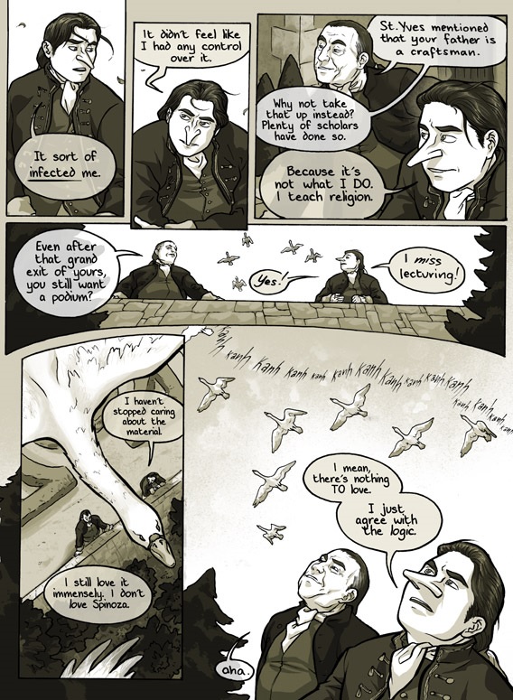 De comic wordt geschreven en getekend door Dylan Meconis, die - zoveel wordt duidelijk - wel iets met Spinoza heeft. Het verhaal speelt zich af in het 18e eeuwse Duitse academische milieu. Hoofdpersoon Luther Levy, die gepromoveerd is op Spinoza, wordt verwijderd als docent aan een school vanwege onpopulaire meningen over Spinoza. Vervolgens lukt het hem een positie te verwerven in een verre uithoek in Bohemen, waar hij weer verwikkeld raakt in kwesties met de rector en met diens dochter die de universiteitsbibliotheek beheert. Er ontstaan telkens weer crises over geloof, academisch beleid en superstitie waarin weerwolven een rol spelen.