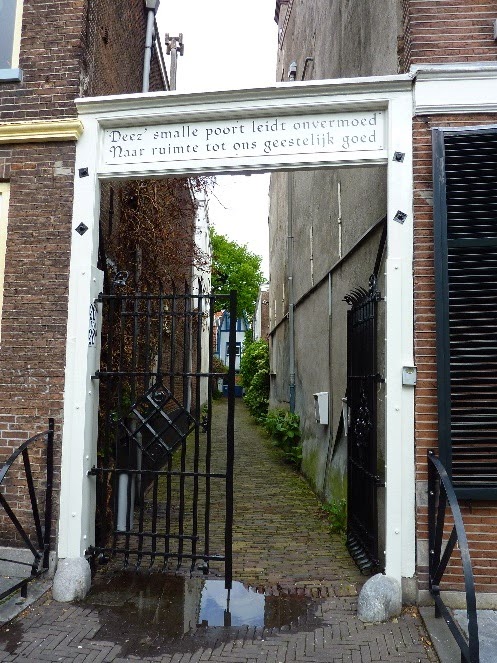 De doorgang heeft deze naam in de volksmond, en geldt niet alleen de houten poort met smeedijzeren hek, die waarschijnlijk uit de 18de eeuw stamt. [Cf.] Wellicht denken sommigen vanwege deze benaming dat de tekst die op de houten poort is aangebracht,"Deez' smalle poort leidt onvermoed naar ruimte tot ons geestelijk goed", naar Spinoza verwijst, maar die tekst verwijst naar “Het Lokaal van de Vergadering van Gelovigen”, het lokaal van de Darbisten, ook wel ‘gelovigen’ of ‘broeders’ genoemd: het kerkgenootschap dat gesticht werd door H.C. Voorhoeve en waarvoor K. Stoffels rond 1870 het huidige kerkgebouw ontwierp. [Cf.]