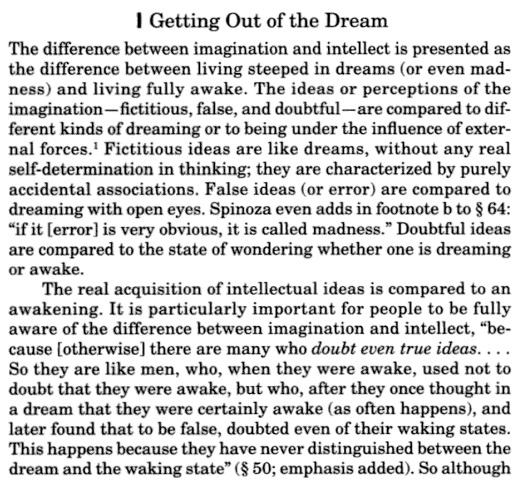 Uiteraard is de geschiktheid om goed waar te nemen (door Spinoza onder de imaginatio gebracht), de dingen die daadwerkelijk aanwezig zijn zien en kunnen thuisbrengen, waarvoor het geheugen een belangrijke functie vervult en het vormen van mentale constructies (‘beelden’), zeer belangrijk om ons dagelijkse leven te kunnen leiden. “Op deze manier weet ik bijna alle dingen die nuttig zijn in het leven”, zegt hij in de Tractatus de Intellectus Emendatione [TIE 22]. De TIE is de enige plaats waar Spinoza dit zegt. In de Ethica gaat het allemaal snel in de richting van: tot rationele kennis zien te komen en de hoogste deugd zien te bereiken: “Est igitur Mentis absolute virtus intelligere” [dé deugd bij uitstek is dus begrijpen], [4/28d]. [Tussen haakjes: Henri Krop vertaalt daar veel te zwak met: “Het kennen is dus zonder meer een deugd van de geest” – daar kom ik later nog eens op terug]. Maar ook voor de TIE geldt dat we de imaginatio zo spoedig mogelijk dienen te doorzien: dat helpt ons het beste, ook in het dagelijkse leven. Geen wonder dat De Dijn in zijn boek over de TIE aan een paragraaf de titel kan meegeven (en zie hier de aansluiting op het vorige blog): Getting out of the dream [cf. books.google]