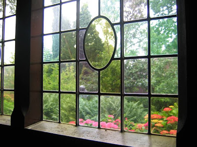 Doorkijkje naar de tuin met de buste van Spinoza, gemaakt door Oswald Wenckebach (1895 - 1962).